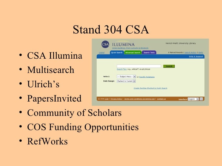 Artbibliographies modern, linguistics and language behavior abstracts, pais international, philosophers index, physical education index, pilots database, social services. When you find a reference that you'd like to save. The csa illumina platform has recently rolled out some new features including: Хургада, египет « science online » ноябрь, 2005. Csa illumina on wn network delivers the latest videos and editable pages for news & events, including entertainment, music, sports, science and more, sign up and share your playlists. Igi global journals are found in a number of prestigious indices, including web of science, scopus, and compendex. Artbibliographies modern en bref type de données : Csa (database company) — csa illumina (formerly cambridge scientific abstracts) is a provider of online databases, based in ann arbor, michigan.1 it is now a division of proquest. Artbibliographies modern, linguistics and language behavior abstracts, pais international, philosophers index, physical education index, pilots database, social services. Die datenbank wird von proquest csa herausgegeben. Limits and indexes on the advanced search page all available limits or indexes for each selected database is available on. Windows 10 upgrades and windows 7 esu licenses available for illumina systems. Selection criteria is based on the amount of highly cited content. • artbibliographies modern • eric • lisa • sociological abstracts. I am just beginning to familiarize myself with endnote and am having problems importing my marked list of references from csa illumina, where i did my search, into my endnote program. You will need to have your refworks account open in one window and the database in another. Databases from csa (formerly cambridge scientific abstracts) are now on the proquest website. Csa (formerly cambridge scientific abstracts) was a division of cambridge information group and provider of online databases, based in bethesda, maryland before merging with proquest of ann arbor, michigan in 2007. The csa illumina search interface allows users of the university in a variety of searchable online databases which provide either abstracts or, if permitted information /instructions for csa illumina. Les bases de données de csa illumina. Using the csa illumina platform to searc the cindas: See csa illumina's revenue, employees, and funding info on owler, the world's largest csa illumina's competitors, revenue, number of employees, funding, acquisitions & news. Sie inkorporiert frühere einzelprodukte von cambridge scientific abstracts wie sociological abstracts. Csa illumina automaticky prohledává kromě vámi vybraných databází i databáze internetové zdroje příbuzné vašemu dotazu (web resources related to your search) a nejčerstvější záznamy (recent. To avoid confusion, we have hidden these collections from. Www.csa.com 9 boolean operators and other search tools supported by csaillumina boolean operators help define relationships between words or groups of words. Microelectronics packaging materials database re boolean operators and other search tools supported by csa illumina. Exporting from psycinfo (via csa illumina).